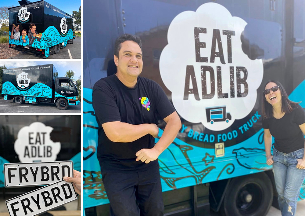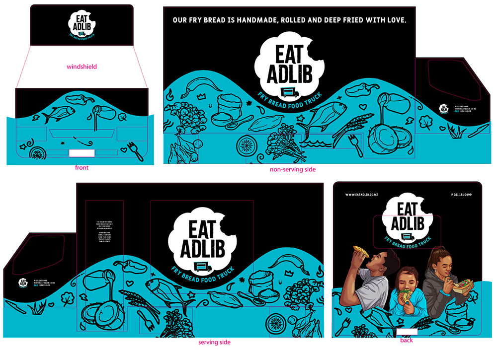 James and Alicia-Kate from Eat Adlib Fry Bread Food Truck needed a fresh new logo and a full vehicle wrap for their extra large food truck. A fully self contained kitchen on wheels serving handmade fry bread with delicious Kiwi fillings such as pork and watercress, kumara and cashew and chilli lamb.