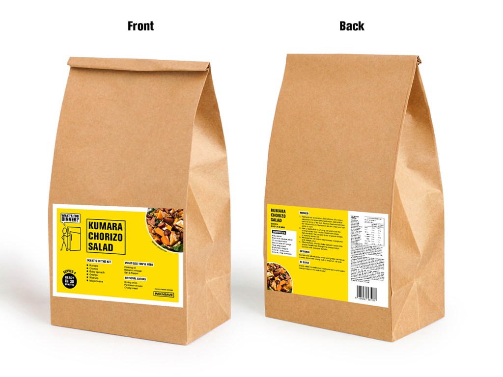 Sticking to PAK’nSAVE’s strong existing brand, Monster created a front and back design for a kraft brown paper bag meal kit. This solution is easily printed and assembled by staff at various locations across New Zealand.